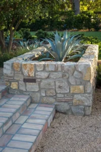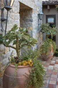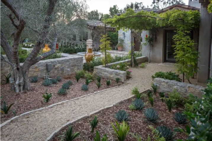 The project reflects a French-cottage style mixed with Mediterranean plant design and hardscape elements. Integrated terracotta tile installations around the pool and home entry create an “old world” Mediterranean garden aesthetic while adding contrast in color and variations in texture to the landscape. Meandering pathways wind through the vineyard and citrus groves, while water features create soothing sounds of water throughout the garden.